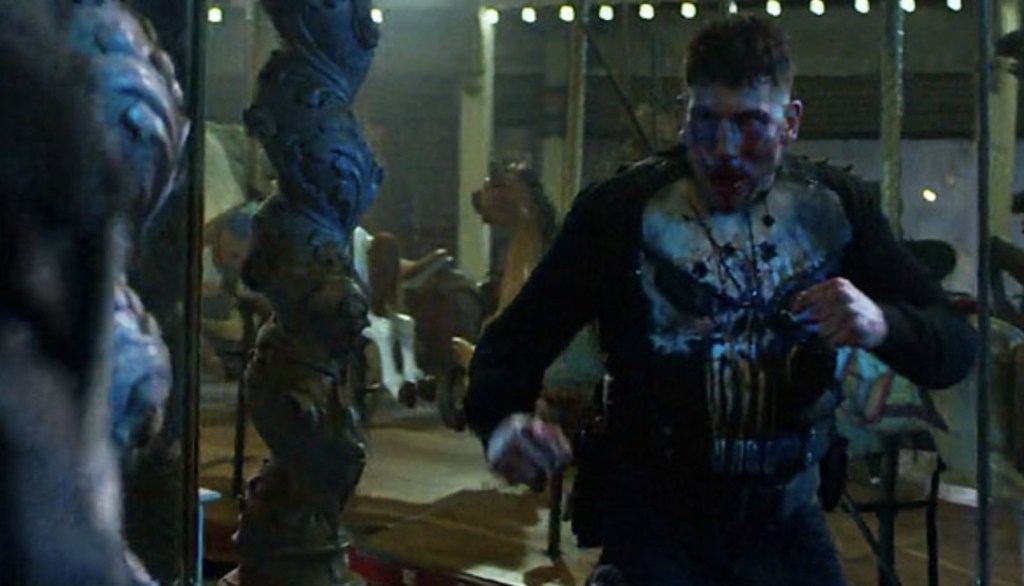 With Rawlins stabbed, bitten and beaten to a bloody pulp, it seems that the head has been finally cut off the snake known as Cerberus. However, while his former boss muses that he looks like he’s been “hit by a train”, the train in question isn’t quite finished yet. With former friend and confirmed turncoat, Billy Russo is still in the wind and Frank Castle isn’t about to let his betrayal stand. However, it’s Billy who makes the first move by holding mutual buddy Curtis hostage in an attempt to draw Frank out. While it works after a fashion, the two (and a wounded Curtis) find themselves locked in a stalemate and aggree to meet later that day at a neutral spot where they can finally settle their differences once and for all. Needless to say, in an attempt to be poetic, the ground chosen to be their arena ends up being the carousel near where Frank’s family met their untimely ends which will no get into Castle’s head.