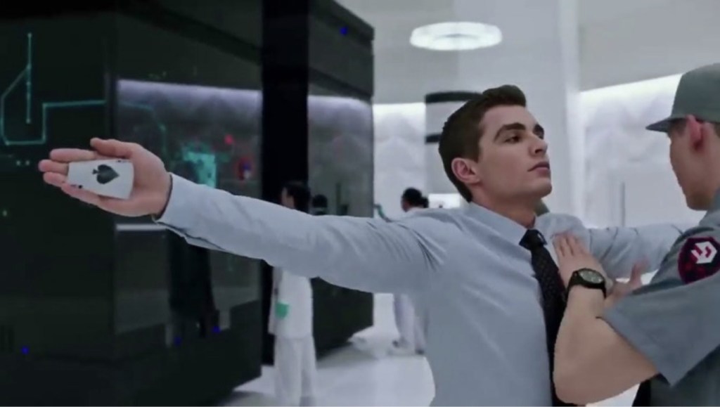 Also, now that the Horsemen are on the run, it also means that they have to get their hands dirty onscreen rather than magician-splaining their way through the trick after the fact. In fact, the films crowning achievement, an absolutely ludicrous scene that involves them all pulling all sorts of sleight of hand type bullshit in order to keep a playing card-sized component one step ahead of the most protracted frisk-down in cinema history. In fact, the set piece may in fact be the perfect litmus test of the franchise so far, because if you can buy all the card flicking shenanigans that goes on in that single scene without telling the movie to fuck off, then chances are this is probably the series for you…