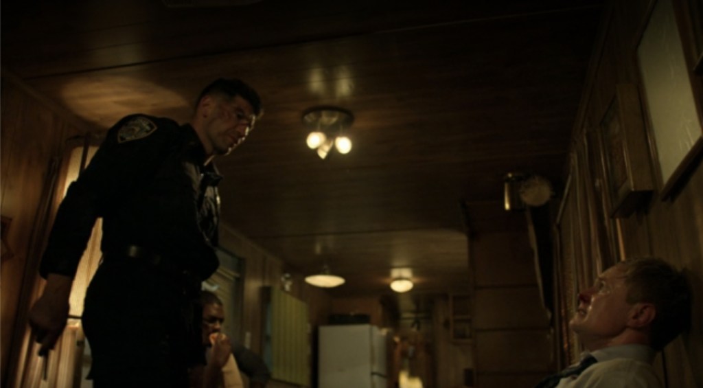 Despite only escaping from police custory only an episode ago, once again Frank Castle finds himself in the grip of the long arms of the law after the increasingly obsessive Detective Mahoney catches him in the midst of creeping out of hospital wearing a police uniform. To be fair, he’s also caught Madani red handed as she aids him out, but he’s so determined to get the vigilante to the precinct himself, the cop hurtles away in a commandeered ambulance with Frank handcuffed in the back. However, while Mahoney thinks that he’s finally caught Castle once and for all, a battered, mad-with-grief John Pilgrim roars up in a sten cop car and starts peppering them with machine gun fire but after a brief chase, Madani manages to show up and fend him off while Frank rescues his would-be captor from a fiery demise, finally giving Mahoney some insight into the complex man the Punisher truly is.