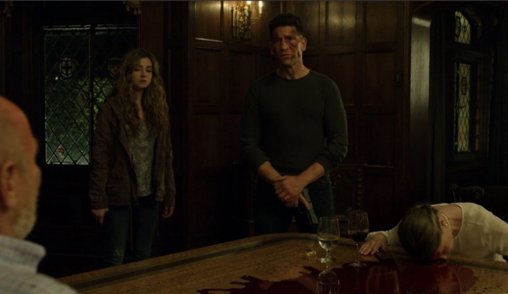 While those pesky story issues remain messier than the aftermath of one of Castle’s assaults, The Whirlwind manages to find Bernthal’s temporary final hurrah virtually moving at every speed the character can muster. We obviously get Savage Frank after he and Pilgrim tear up a hotel room with bullets and then later batter each other with lead pipes and chain wrapped fists, but at the other end of the Punisher spectrum we find that the Surrogate Father Frank is still very much in play despite the relationship between him and Amy getting lost over during the last few episodes. While some Punisher purists might take issue with a “gentler” Frank, Betnthal’s touching, but still ludicrously masculine performance managed to find genuine heart in the breast of a man most famous for spraying criminal brains over as many surfaces as he can. We even get a glimpse of Reasonable Frank who manages to talk John Pilgrim around after they’d both bee chasing each other’s tails for so long, and of course, lurking somewhere in-between, lies Cold Frank as evidenced by the way he cooly dispatches the Schultzs and his final, wordless confrontation/execution of a fading Billy Russo.