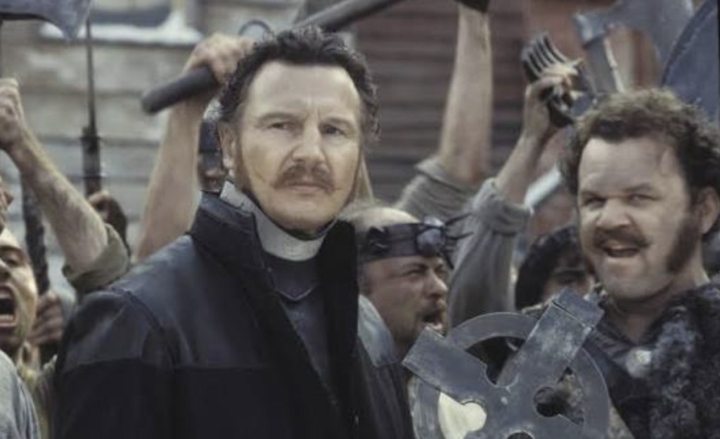 While it’s fair to say that the comings and goings of an average citizen of the New York slums of the 1860s would be fairly turbulent, one thing that Scorsese manages to nail throughout the messy and flawed runtime of Gangs Of New York is a sence of frenetic chaos that these violent and politically frenetic times seemed to come with. In fact, out of everything that the legendary filmmaker that hurls at the screen, two aspect manage to stick fast and hold the attention even when everything else about seems to have a varied effects and the first thing one notices is the painstaking efforts everyone has gone to to realise such a battered and bruised part of New York’s history. Vast, rickety looking sets tower over the cast as the melting pot of the slums of the five points offer up the type of rogues, crooks and whores all piled together that you’d usually find in scenes of Whitechapel during a Jack The Ripper movie. There’s no imagination necessary as you look around some of the most immaculate sets built for a movie and they somehow look even better when armies of thugs are bludgeoning each other sensess in the streets in the absolutely stellar opening sequence. In fact, watching Daniel Day Lewis pulling his best DeNiro face from under a luxurious mustache as he engages a crucifix waving Liam Neeson in mortal combat proves to be so good, the film struggles to best it as we then move on to a more standard revenge tale.