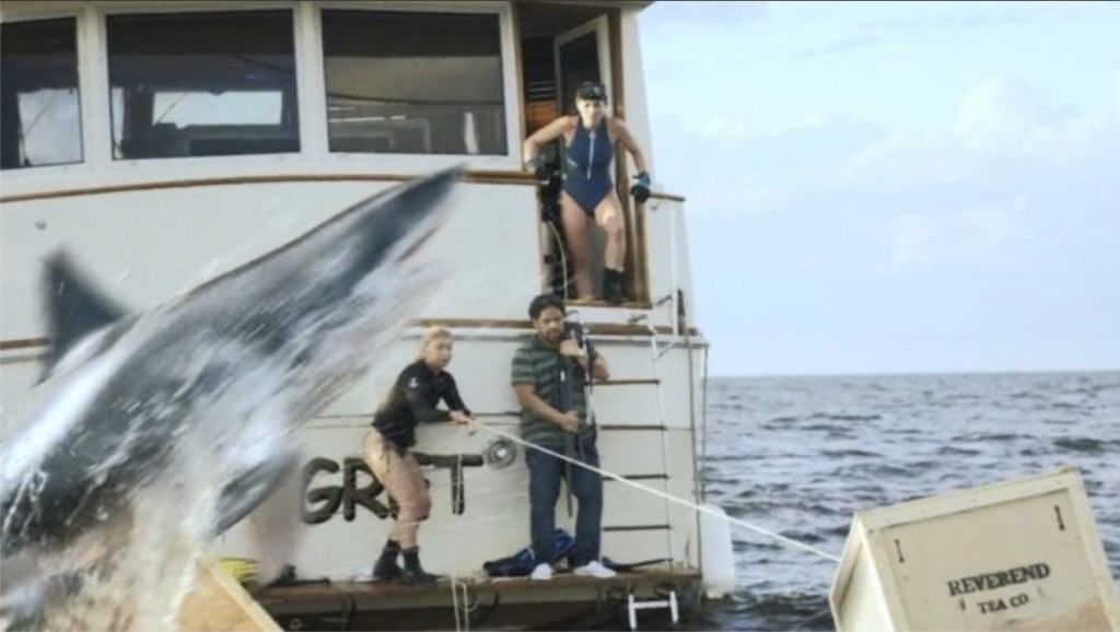 Leading from the first page of the Modern Shark Movie Handbook, we find widow Gia taking out the boat she got as a wedding present from her husband, Dalton, as a way to process the trauma she’s experienced since his death. However, as she fishes and dives, lurking beneath her is four crates of a drug shipment disguised as matcha tea that had been dropped from a plane the night before. Why hadn’t they been collected by the underlings of overacting crime boss, Leo Reverend earlier? Well, that’s just the problem – they did, but to their detriment they found that the sharks in the area are frenzied to the point that they’ll happily leap on the boat to eat its meal to death.