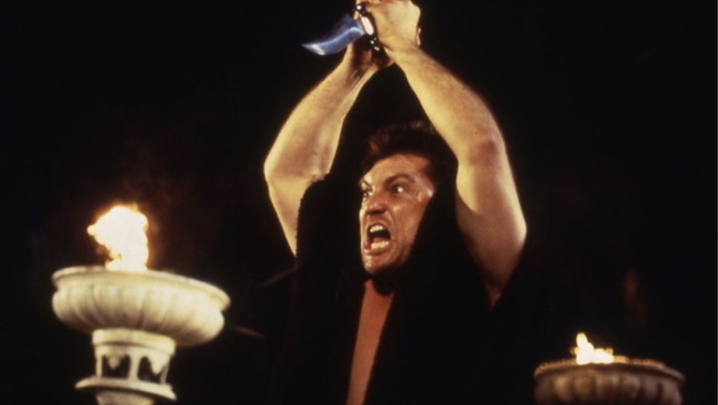 Elsewhere, we find the usual array of clumsily staged comedy/action setpieces that seem like they’ve been written by a fifteen year old boy caught in the throes of puberty, a leather clad satanist picks off slow moving security guards with ninja stars, Barbara Alyn Woods’ police chief trades awkward sexual banter and pulls guns on a dude who accidently throws a condom on her and Jonathan’s hooker girlfriend only seems included because the sacrifices Faust demands seemingly aren’t limited to virgins.