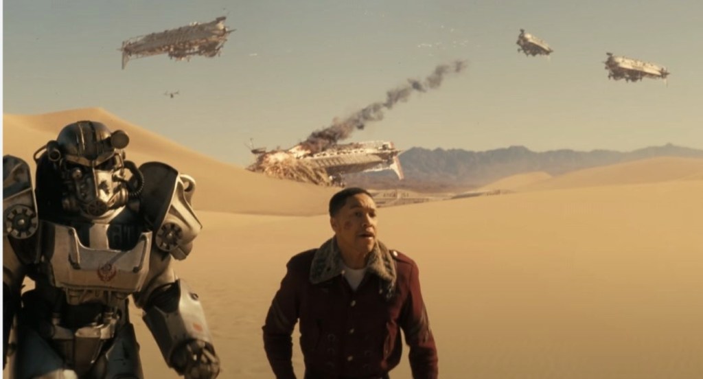 However, despite the fact that Lucy’s storyline contains Elvis zombies, drug addiction and the debut of the hulking, mutant, murder machine known as a Deathclaw and Cooper’s usual flashback takes us back to his days in the Sino-American war, once again its Maximus’ hand in the rapid collapse of the Brotherhood which still holds has the best stuff this season. In fact, most of the macabre, ironic, farcical tone that the first season set has been mostly carried on by the formally serious Brotherhood as the chaos spiral that Maximus is trapped in just keeps getting worse. Watching an anxiety-ridden Thaddeus desperate try to pass as Harkness without realising that his terrified mutterings are being broadcast out of the Power Suit’s speakers. Finally, the dam breaks and the squabbling members of the other factions finally come to blows with a minimum of prodding and the sight of Maximus and Thaddeus fleeing as the Brotherhood erupts into war behind them is the cherry on the cake for a massively enjoyable plot thread.