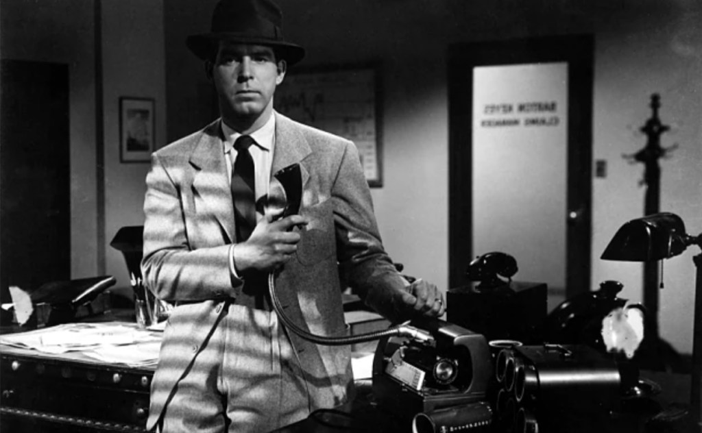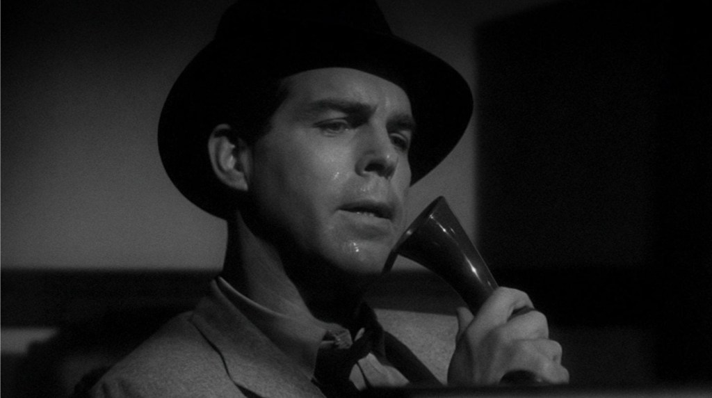 That’s right, the sordid tale of Fred MacMurray’s bewitched insurance salesman hatching a plan to off the husband of Barbara Stanwyck’s golden haired temptress is delivered mostly with dialogue that positively crackles as flirtations and sass are served back and forth like a rapid fire tennis game. In fact, the only correct way to fire back a witty, Billy Wilder retort is to utter it as quickly and as glibly as possible in order to get that right amount of sizzle right off the back swing and his two leads do it so well, the conversations feel just as action packed then any kind of physical exertion could. While I have to say that MacMurray struggles to look anywhere near the age range that his character is supposed to be (althougg even people who actually were in their thirties in the 40s strain to look convincingly under 45), you utterly buy that his libido and ego have united to steer him into wanting to commit cold-bloodied murder thanks to the lure of Stanwyck’s plotting gold digger.