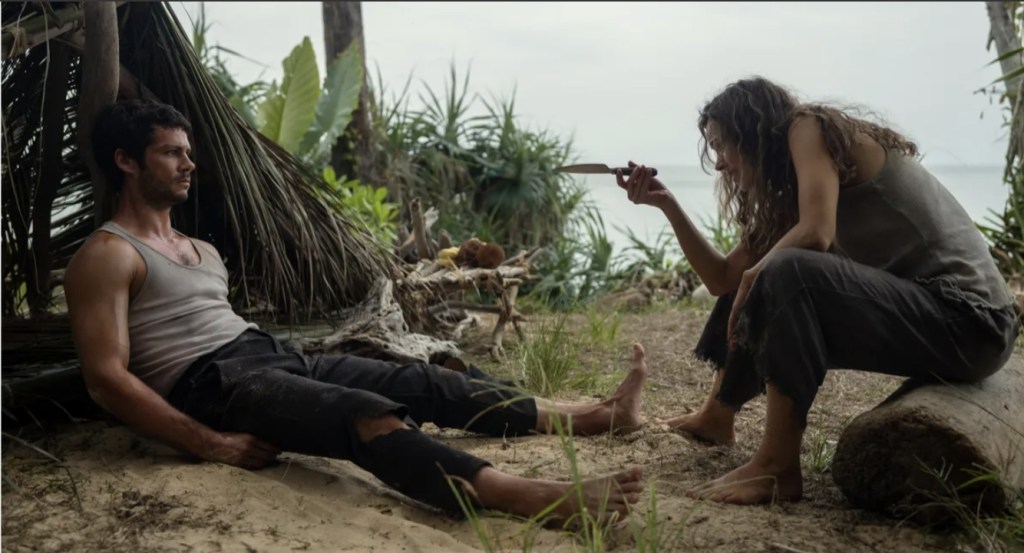 While some Raimi purists might argue that the director is holding off on some of his more audacious camera moves, that endearingly spiteful streak is evident in virtually every frame. Watch as how pathetic Bradley gets in his attempts to go it alone, Linda be comes more flamboyantly capable, weaving herself hats and a cute little knapsack while producing meals so succulent they could be on the cover of a magazine. Of course, just because Raimi isn’t turning his gonzo abilities up to Evil Dead II or Drag Me To Hell levels, it doesn’t mean that he doesn’t bust out some of those patented, stylised moments here and there. Be it McAdams getting coated in layers of gore and mucus when she tries hunting a boar, to some poison berries causing some projectile vomiting directly into O’Brien’s upturned face, Send Help simply can’t help trying to gross you out whenever it can and even Raimi’s sizable horror fan base will rejoice when he decides to get really mean. The memorable plane crash allows Sam the man to indulge in some of that ghastly slapstick he’s so fond of and we even have a sequence that allows him to go full “spook-a-blast” (his loving term for a fairground type scare) to magnificent, scream/laugh inducing effect.