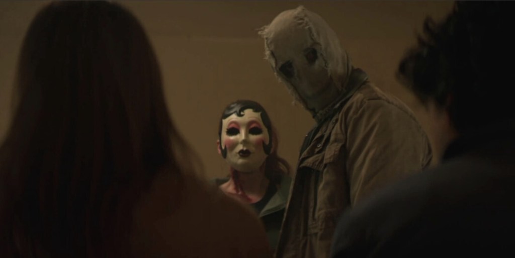 It seems that while Scarecrow and Pin-Up Girl (real name Shelly) has been up to this murderous cult shit since they were kids, after his brief mourning period is over, Scarecrow feels that Maya has the moxie and inner darkness required to wear the mask of his former love. I guess Dollface is cool with it too, because before you know it, their former victim is now being groomed to round out their trifecta and is bring brought along on the Strangers’ brutal killing sprees.
