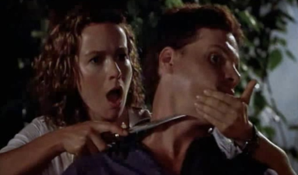 In fact, right from the word go, that low-rent feeling is full in effect when we greet a Crypt Keeper that seems to be a little… off. Yes, getting voice actor John Kassir to do a highly dubious Jamacian accent isn’t exactly the Keeper’s finest hour, but the puppeteering is also so stiff that it looks like our hideous host has a broom stuck up his backside. While I would also say that all the leering at babes in bikinis also seems out of place, when you see the constant state of undress of lead actress Jennifer Grey (yep, that’s right; Dirty Dancing’s Jennifer Grey), it soon starts to make a whole lot more sense.