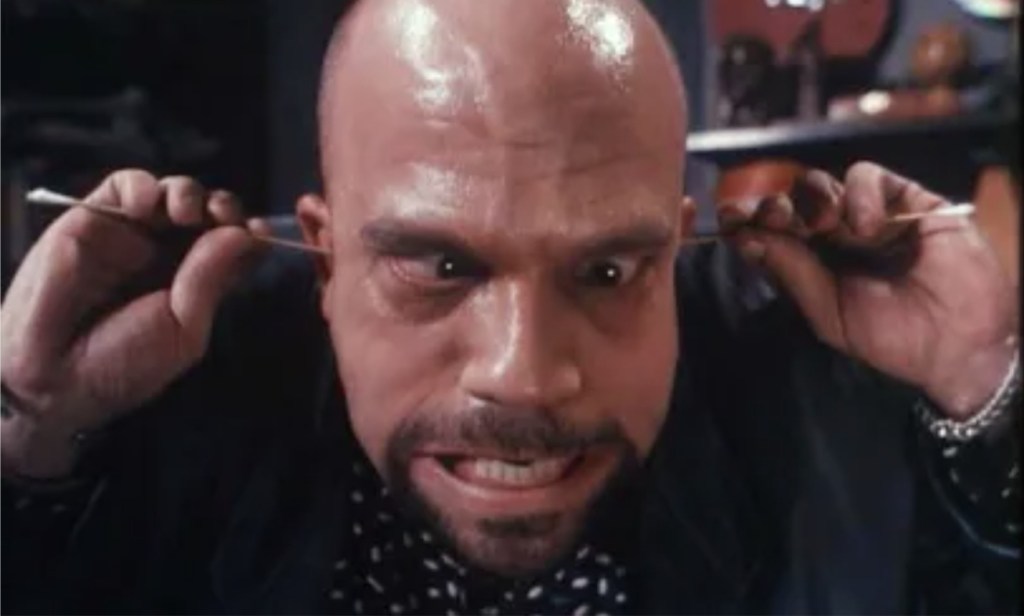 The rock music aspect of the episode keeps things moving fast and weird and it’s something of a relief for an episode to focus on such a different kind of scuzzball, but best of all, Price knows to throw subtlety clean out of the window when it comes to a tale about a man literally being driven mad by his own conscience. In fact, giving a headbanging makeover to an Edgar Allan Poe style story of guilt is exactly the sort of chaotic tricks this show should be trying to pull off every week and matters are made all the more frenzied thanks to Lee Arenberg seizing the lead role and throttling the living shit out of it. For those of you who can’t quite place the name, throw some scurvy on him and rotten up those teeth and he’s best known as Pintel the pirate from Pirates Of The Carribean (“Ello poppet.”) – although, if it helps, he also played the perpetually fire farting Eternal Flame in Alex Winter and Tom Stern’s Freaked.