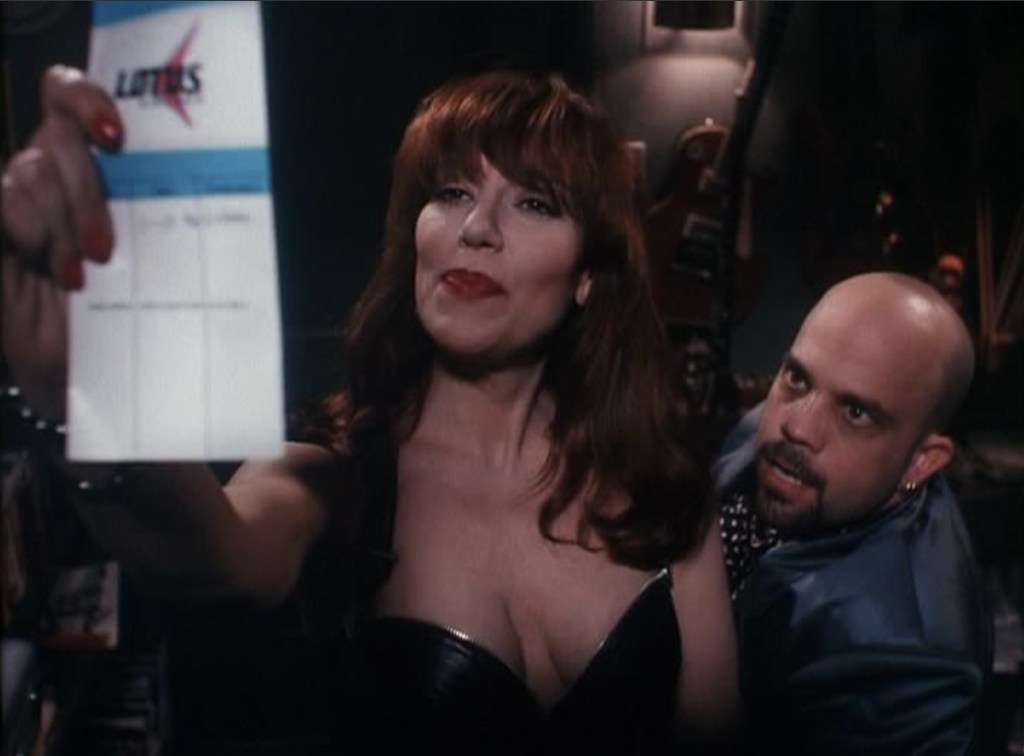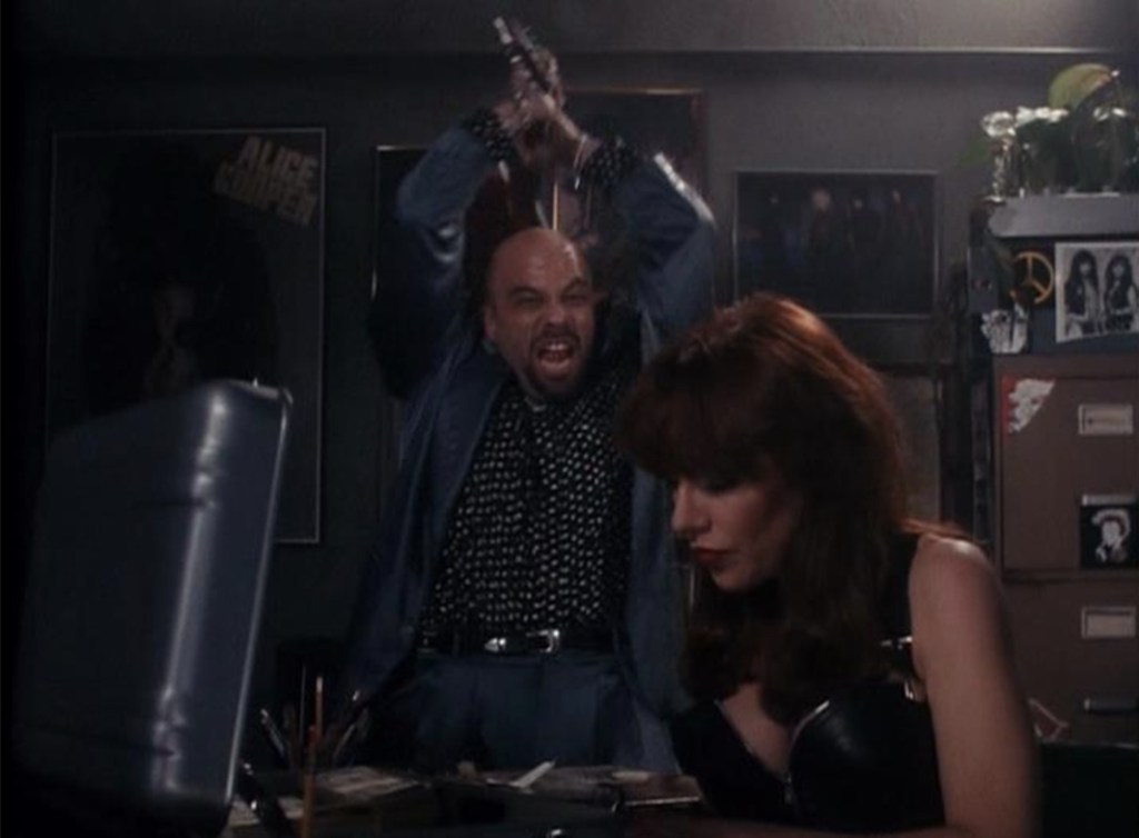Anyway, watching him gurn, scream, eyeroll and perspire his way through the episode is a joy to watch and what makes things even wilder is that his conscience is voiced by notoriously shouty comedian, Sam Kinison, who not only adds to that steadily rising decibel level, but proves to be perfect casting. Rounding out the episode is Katey Sagal, who gets to ensure that she adds herself to the steadily growing pantheon of female money grabbers featured in the show, but while she’s nowhere near as abrasive as some of the other cast members, watching her rock a goth look before having her skull smashed in with Pete Townsend’s guitar and her body stored in Donny Osmand’s drum cajón adds to the unpredictable cartoon energy even more.