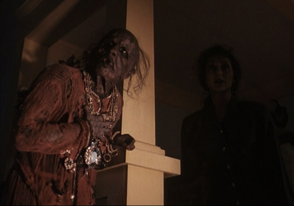 But after burying the witch, Judy finds herself still drawn to the necklace that she’s insisted they keep and as the months pass, the urge to put it on becomes too great and she reasons that nothing should happen because the old woman is dead an buried. However, upon putting the offending jewellery back on, she finds that it still has the mojo to pull the old switcheroo – with the dead, moldering body hidden in their basement. Donald tries to put things back once again, but his shoot first, as questions never attitude comes back to bite the couple in the worst way imaginable.