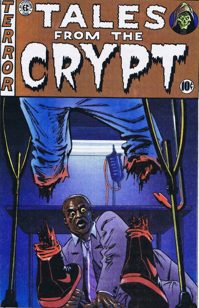 Of course, a great central performance, a solid story and the fact that the season is finally offering up a non-white cast is all exemplary, but to really take Crypt gold, you really need to round things out with a bang – and Fitting Punishment proves to make good on that title. Yes, it’s the typical EC Comics “cop out” of a character suddenly rising from the grave for no other reason that some supernatural fair play needs to occur, and those new to the days when ghosts, zombies and poetic justice would suddenly just happen because the story demands it to may feel that it’s a tad underwritten. However, this is just how horror comics of 50s used to roll and you can’t deny that Fitting Punishment wraps things up in style. As horror spreads across Ezra’s disbelieving face and he starts praying to a God he frequently misquotes, the sight of a ghostly, footless Bobby coming down the stairs solely supported by his crutches proves to be a near-perfect, Crypt image. But even better, Bobby is added by the ghoulish sight of his own, severed feet as they hop down the basement steps to get even with the guy who severed them in the first place. Gunn even gets to bellow one final “NOOOOOOO!” before the screen cuts to black, so if that doesn’t make this the ideal close to a perfect damn episode, I don’t know what will.
