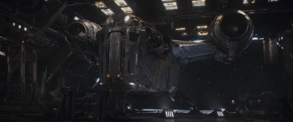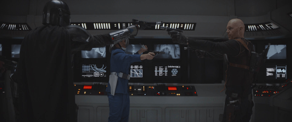 The action here is more about tension than spectacle. The Mandalorian moves through the ship using stealth and strategy rather than brute force. There are moments of close-quarters combat, but they feel grounded and deliberate, emphasising the danger of the situation rather than overwhelming it with scale.