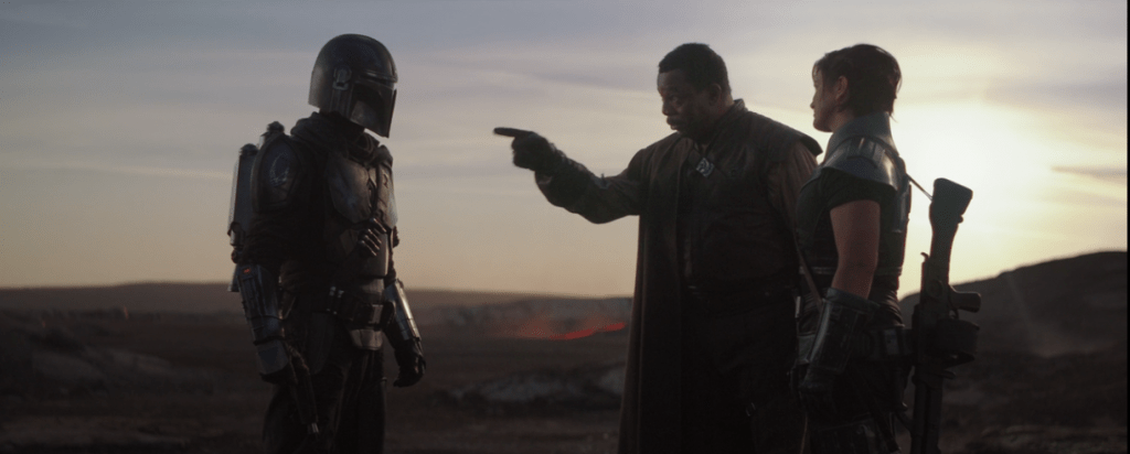 Amid the action, the episode also delivers important character moments. First we finally get the reveal of the Mandalorian’s name – Din Djarin – which is information dropped by Moff Gideon, setting him up as an all-knowing villain. Then Din is forced to remove his helmet for the first time. This moment, handled with restraint, adds insight into the strict code he lives by. It’s a quiet but meaningful development, emphasizing that beneath the armor is a person shaped by trauma and tradition. The episode also expands on Mandalorian culture through the revelation of the Armorer’s role and the concept of the Mandalorian as a foundling. These details add context to why Din so protective of the child. What began as a job has now become something much more personal.