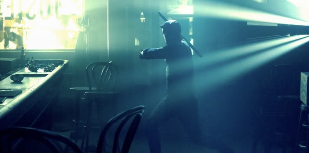 While the opening salvo of season 2 was great, it was such a dense episode that I didn’t even have room to mention some of the visual flourishes directors Benson and Moorhead put into the episode that enhanced the experience further – luckily, they’re back for this episode too, so now that the vast interlocking mechanics of that plot have groaned into motion, I’ve got some breathing room of my own to cover them. I have to say, I’m loving the visual quirks that the show has started to give some of its more extreme characters more of a visual presence and whomever thought to gradually change the aspect ratio of the show whenever Daredevil uses his super senses needs some sort of award, or tax break, or statue, or something as it proves to both me exhilaratingly subtle and ridiculously badass every time it happens. It also compliments the returning quirk of turning the contrast of the screen blue whenever Bullseye is making his presence felt and the lunatics decision to act on his deranged heroic impulses is a particular thread I’m looking forward to pursuing.
