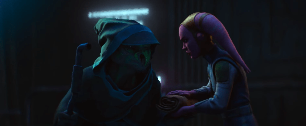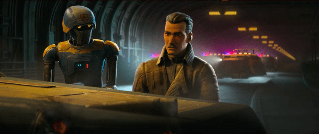 The episode builds directly on the established animation style that has been Lucasfilm’s house style since the The Clone Wars, now the best it has ever been, that delivers fluid motion and detailed environments that capture the gritty underbelly and neon lights of Janix. Everything has a film-grain texture and selective brush-stroke lighting, that makes for beauitful night scenes. This creates a noir atmosphere without overpowering the Star Wars aesthetic.