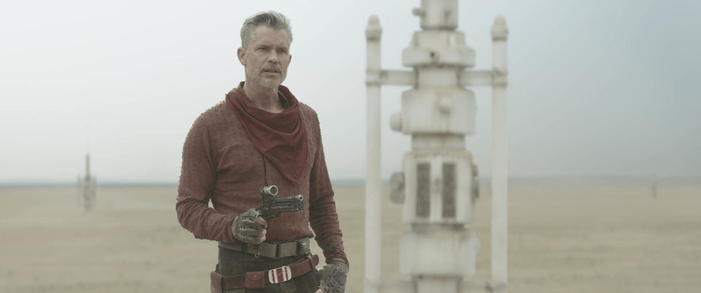 Bane’s confrontation with Cobb Vanth, played by Timothy Olyphant, is one of the episode’s standout moments. The scene unfolds like a classic Western standoff, emphasising tension and character over action. When violence finally erupts, it is swift, reinforcing Bane’s danger while raising the stakes for the conflict to come.