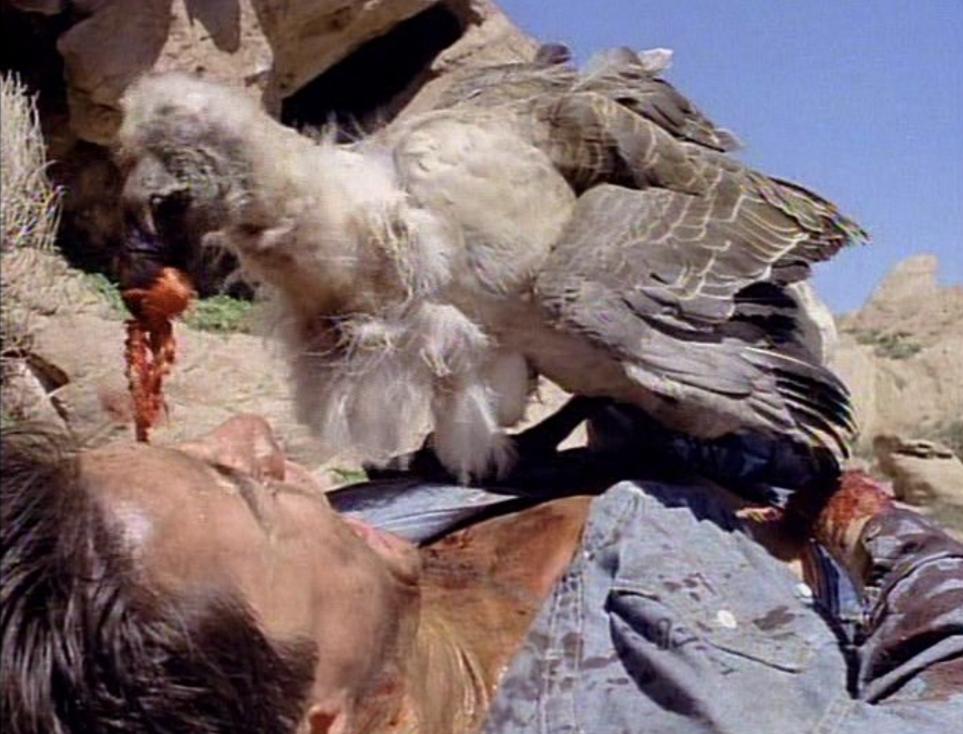 But what de Souza excels most in, is treating his odious lead as badly as humanly possible quite simply because he fucking deserves it. Being chased by a tag team of a traffic cop and a vulture is one thing, but the director keeps turning the screws and tormenting the murderer for our entertainment. Of course, as we all know by now, the build up us vital, but it’s the payoff that usually tests a Tales’ mettle and it’s here that Carrion Death takes it over the top. After fashioning a makeshift hatchet out of a piece of wood and the dead cop’s badge, Diggs attempts to free himself by chopping the hand off from his handcuffed foe, but due to exhaustion and thirst making his vision blur, the moronic murder only succeeds in partially severing his own wrist, which in turn leads him to fall, have his wounded hand torn off and finally break his neck on the rocks below. But wait – we’re not done yet as Diggs’ final punishment hungrily flaps towards him with malice in its eyes and proceeds to grotesquely pick his eye sockets clean while he screams in agony. OK, so the puppet vulture might not be as convincing as it could be, but the tearing out of a paralysed Diggs’ eyeballs certainly more than makes up for it, much in the same way this episode makes up for the weakness of the last one.