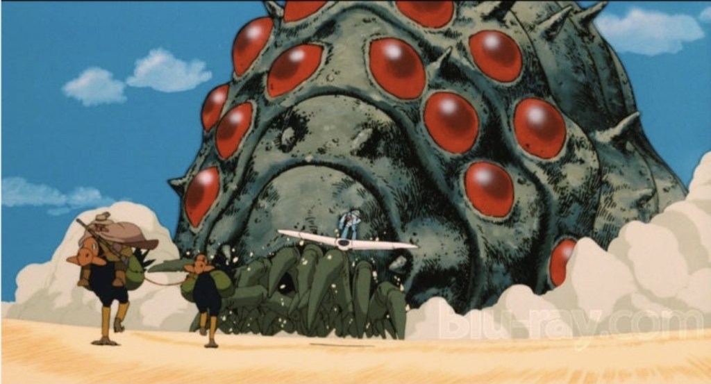 Nausicaä Of The Valley Of The Wind is one of those experiences that somehow both feels deeply indebted to its influences and utterly, utterly unlike anything you’ve ever seen. For example, we’ve certainly seen enough Japanese animated movies that deal with life after a fiery apocalypse – Hell, around 70% of the bastards seemed to operate from that narrative launching point during the 80s and 90s – and what with all the clan of warring kingdoms, savior prophecies and the presence of giant bugs, it’s not long before the spectre of Frank Herbert’s Dune hangs in the air. However, what prevents Nausicaä from being utterly unlike all of its peers (both animated and otherwise) is the peaceful and hopeful outlook it has on life in general. Essentially what Starship Troopers would have been like if Robert A. Heinlein was a pacifist, Miyazaki delivers a spellbinding world that contains so many positive eco-themes and cool retro-futurist tech, it makes James Cameron’s Avatar saga look like it neglects to recycle. We can feel its influences even as far as 2025, because what are the Creepers in Bong Joon Ho’s Mickey 17 if not surrogates for the emotionally complex Ohm, however, while I could take up the entire review suggesting other possible connections to a film the general public may not be fully aware of, I suppose I should get round to turning my attention to the film itself.