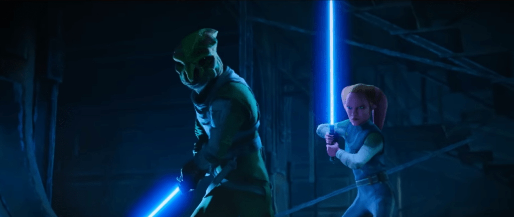 The sequence is staged with clear spatial awareness, using the environment to heighten tension and limit overly flashy maneuvers with lightsabers striking the surroundings. Quick cuts flow smoothly even as the pace accelerates, allowing you to easily follow the action. Rather than serving as pure spectacle, the duel advances character dynamics: it reveals Maul’s strategic patience and interest in Devon’s potential, Daki’s protective resolve, and the internal conflict building within the young Padawan. The fight concludes on a note of restraint, with Maul again allowing the Jedi to withdraw after Devon’s intervention, further underscoring his calculated approach over indiscriminate destruction.