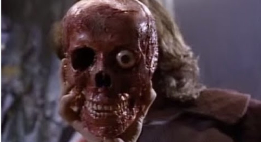However, as good as all of the above is, it’s how well the twist comes off that truly lifts the roof off the joint. A lot of Tales From The Crypt reveals, while undoubtedly fun, often aren’t exactly nuanced affairs, however, with Top Billing, repeated viewings reveal how well Holland juggles the clues. The rows of keys on the wall of the store room; the staff only in reverse on the door; the fateful label on Yorick’s costume falling off at an inopportune moment – it’s all there, even the fact that Robbins is trying to warn Barry about his discovery when Barry kills him. However, once the jig is up and Barry realises that he’s murdered his way into the role of a literal dead man, Top Billing manages to finish everything up in a way that isn’t too abrupt. After the troupe take an axe to the horrified Barry, we cut to the night of the fateful performance with his liberated, still bloodied skull taking centre stage of the famous scene, but after Nathan complements his cheek bones, the episode goes that little bit extra just to round things off with one final, haunting image. As the police amass outside the back entrance to take back the Teasdale Home For The Criminally Insane, Todd Holland’s camera drifts down the trash strewn alleyway to reveal one last, grisly shock – the sight of the peeled skin of Barry’s head laying discarded among the detritus. Now that’s what I call an encore.