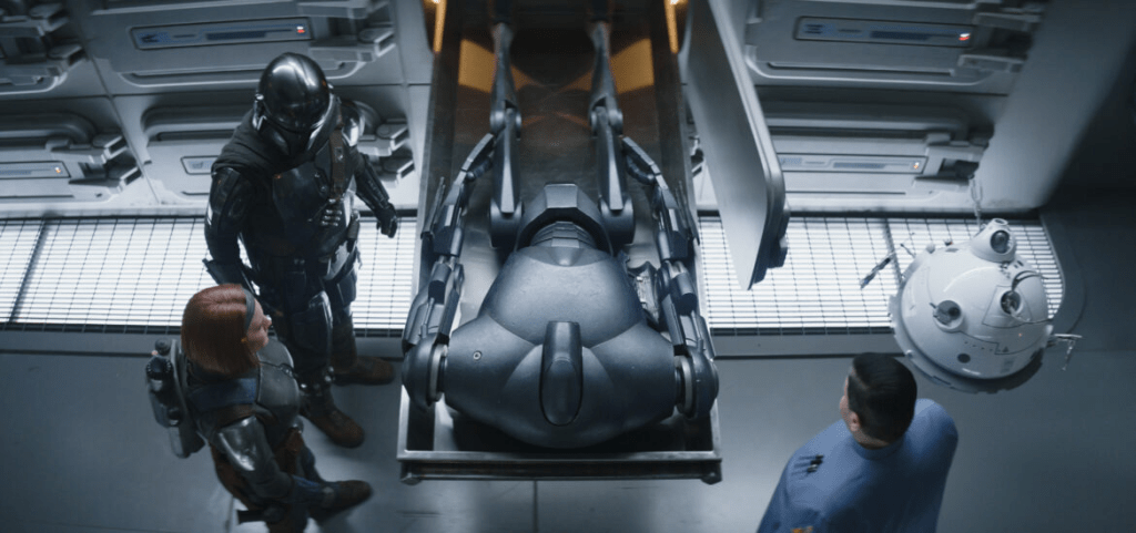 At the center of it all, Din and Bo-Katan remain an interesting double act, even as the story veers into more unusual territory. Din’s interactions with the droids, particularly his blunt, almost hostile approach, provide some amusing moments, while Bo-Katan’s measured, diplomatic demeanor continues to highlight her growth as a leader. Their dynamic remains one of the season’s strongest elements, offering consistency even when the narrative takes unexpected turns.