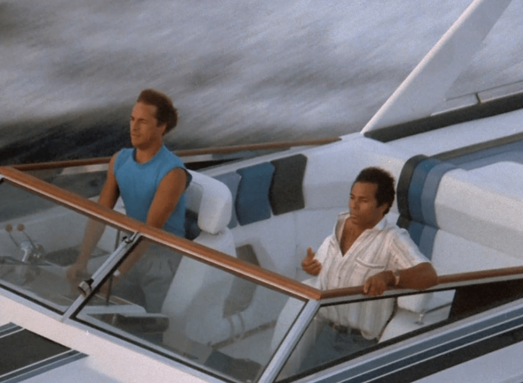 Opening with Crockett and Tubbs interrogating Mendez, the driver and associate of the slain Argentinean assassin, it veers into borderline police brutality. The interrogation yields critical leads pointing to Calderone’s location in Bimini. Motivated by the fresh loss of their lieutenant and the ongoing threat to Crockett, the partners decide to take the fight offshore without full departmental backing. They race off aboard Crockett’s speedboat, crossing into international waters where they have no jurisdiction or back-up.