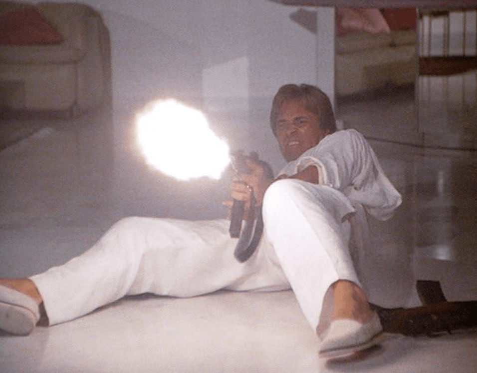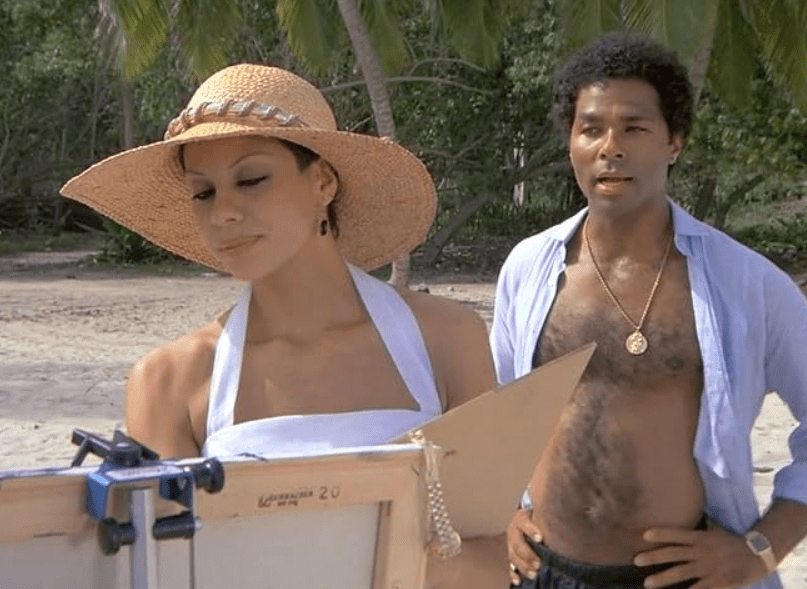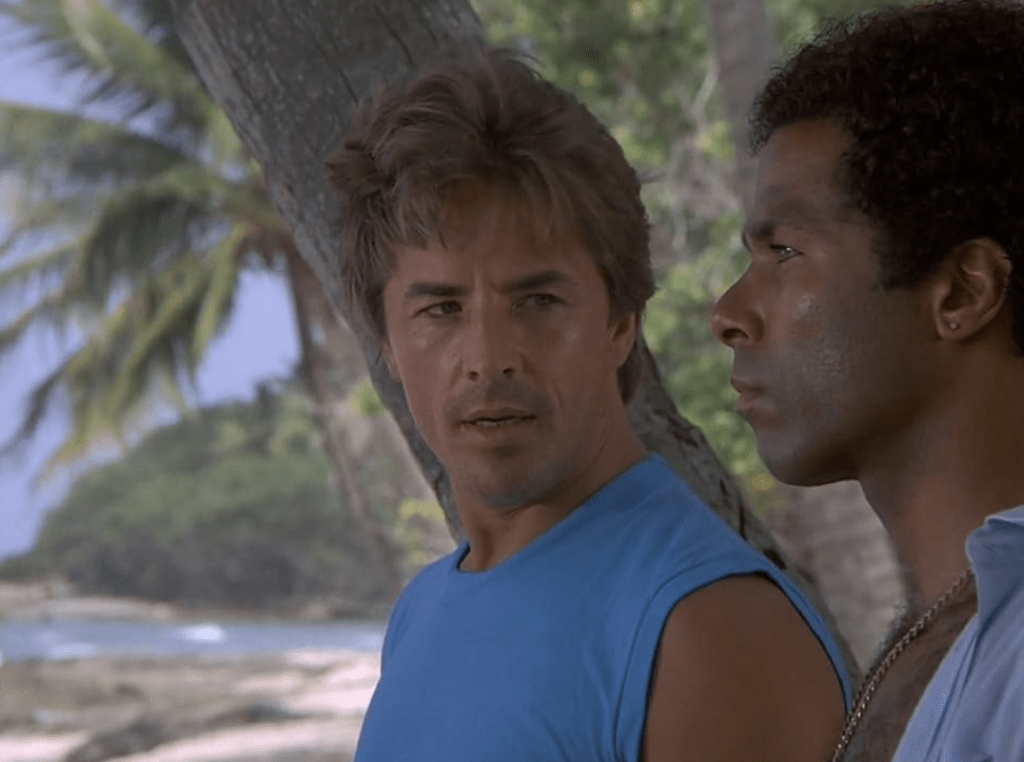 Once in the Bahamas, the tone shifts toward a more exotic, almost vacation-like aesthetic that contrasts sharply with the gritty but still sunny Miami adventures of earlier episodes. The cinematography showcases turquoise waters, white sand beaches, luxury estates, and vibrant island life, reinforcing Miami Vice‘s signature visuals while hinting at the seductive corruption that wealth from the drug trade can buy. Amid the pursuit, Tubbs becomes romantically involved with a beautiful local woman named Angelina Medera (Phanie Napoli). Their chemistry sparks quickly during beachside encounters and social gatherings, threatening to distract Tubb’s from the mission. However, the relationship takes a devastating turn when Tubbs discovers Angelina is actually Calderone’s daughter, wo has been educated abroad and kept somewhat sheltered from her father’s brutal empire. This revelation forces Tubbs into an agonizing internal conflict: his growing feelings for her clash with his duty and the knowledge of Calderone’s crimes, including the murder of his brother.